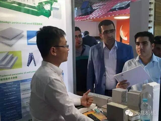 展會上,天意機械銷售經(jīng)理劉春剛細心的向前來咨詢的客戶,介紹了天意綠色建筑建材裝備在建筑行業(yè)內(nèi)的應(yīng)用優(yōu)勢,通過觀看產(chǎn)品應(yīng)用視頻以及展現(xiàn)成品樣塊,使得天意展位前門庭若市。期間,外貿(mào)部銷售經(jīng)理劉春剛,專程拜訪了天意公司在伊朗年產(chǎn)50萬平方的輕質(zhì)墻板生產(chǎn)線合作伙伴。詳細了解客戶的生產(chǎn)情況,幫助客戶免費升級技術(shù)配方降低成本。