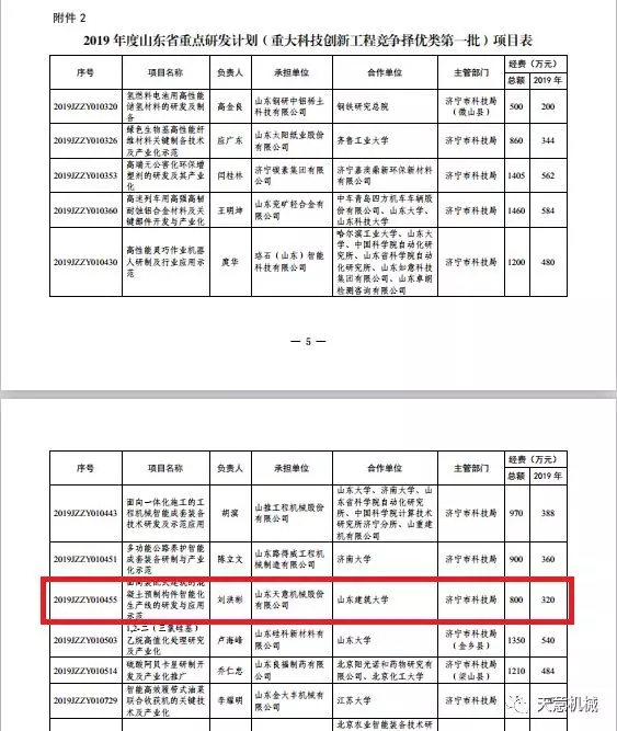 天意機械面向裝配式建筑的混凝土預制構件智能化生產線的研發(fā)與應用項目列入2019年山東省重點研發(fā)計劃,總計資金支持800萬元。